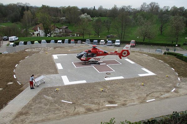 Grösse, Markierung und techn. Ausrüstung nach Anlage 3 zu § 18 (4) LuftVO Aufsetz-/Startfläche = farbiges Betonsteinpflaster Sicherheitsfläche = Rasengittersteine mit Graseinsaat Winterdienst mit luftfahrtgeeignetem Taumittel |